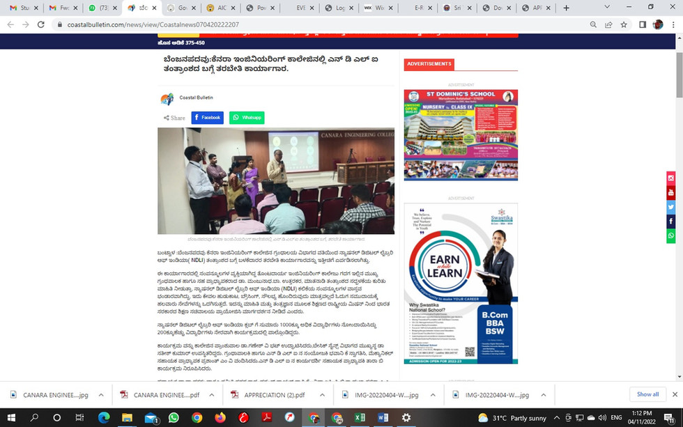 Librarian of TCE Invited as a Resource person for NDLI User Awareness program @ CEC, Mangalore